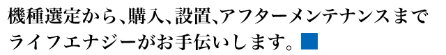 ライフサポートでは、お客様にぴったりの機種の選定から、購入手続き、設置工事、アフターメンテナンスまで