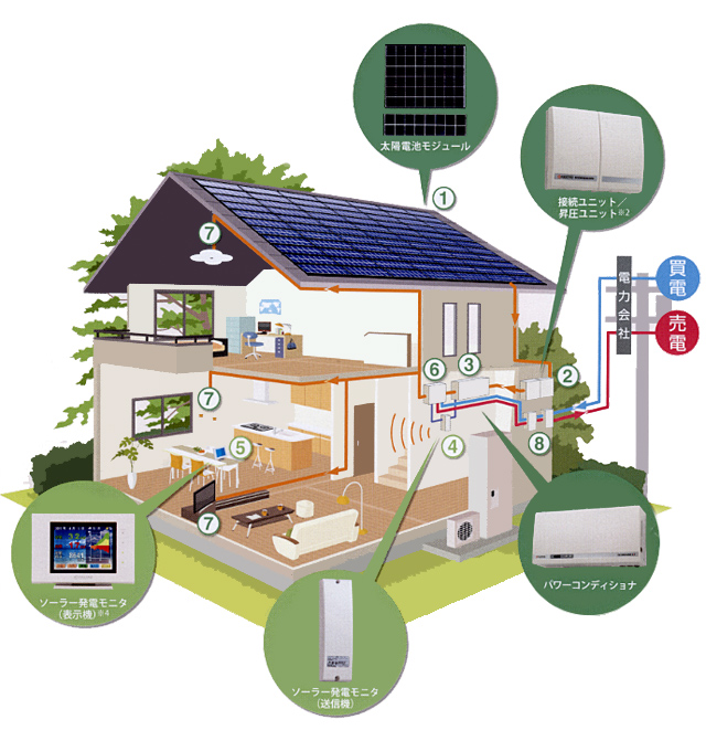 (6)発電した電気は、住宅用分電盤を通り、ご家庭の電気機器(7)でご使用いただけます。